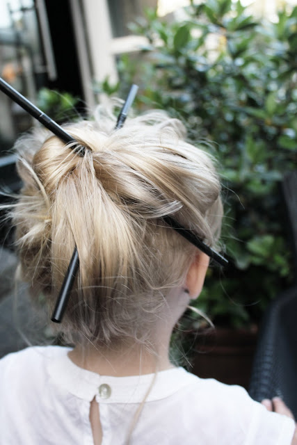 En perfekt håruppsättning när man inga hårband har med sig och håret hamnar i maten annars.
