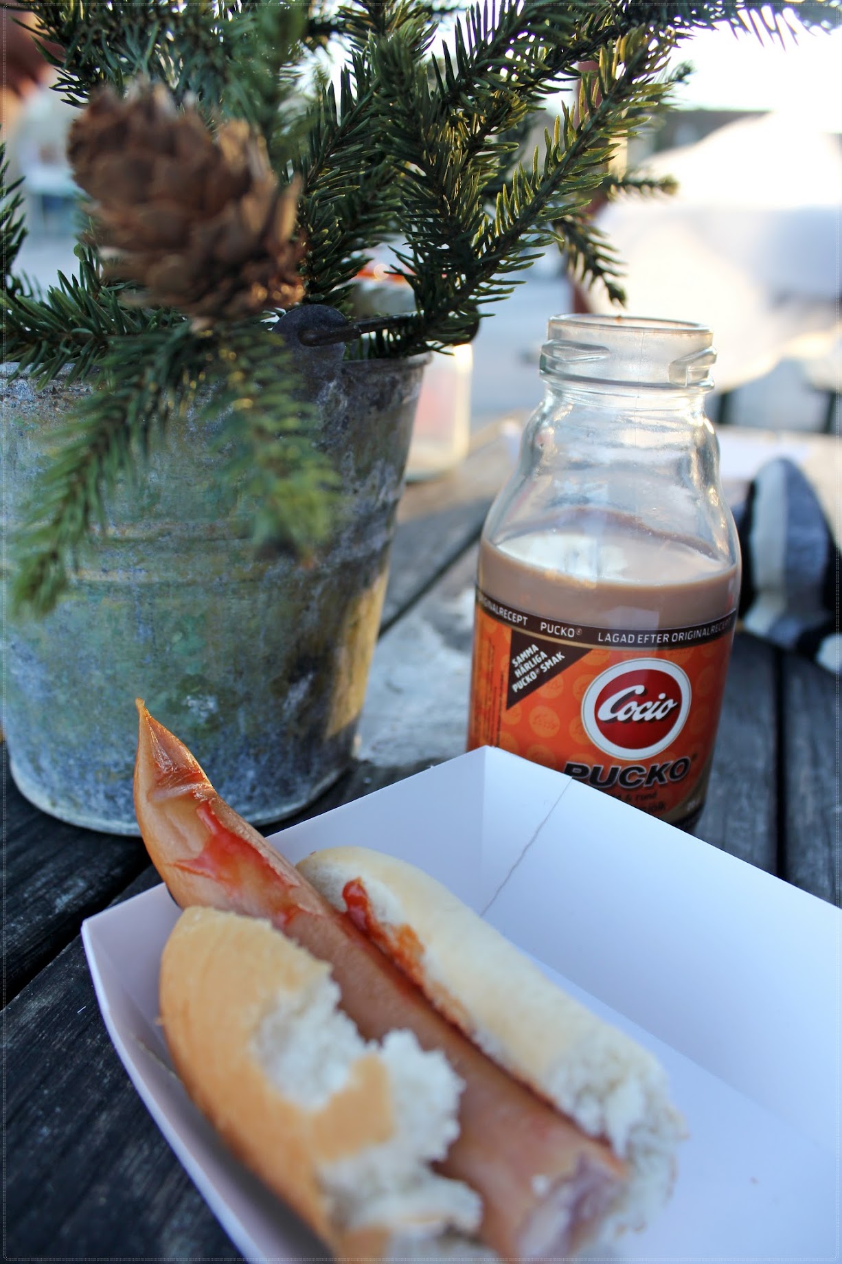Dockans lilla varmkorv som hon har tuggat på:) Här var det sååå mysigt tidigare idag! Vi satt på skinnfällar på långbänkar och åt varmkorv i solens sken och hela stan var full av människor som njöt av det fina vädret!