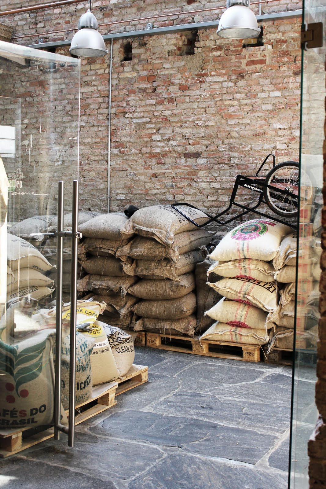 Här ligger det säckar med massa fina kaffe bönor som väntas på att bli malda. Så ruffigt och härligt!